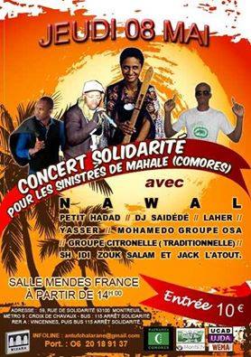 Face à l’urgence de la solidarité nationale à l’égard des sinistrés de la région de Bambao Mtsanga, en particulier la commune de Bandra Mahalé où plus de 1510 personnes comprenant des femmes enceintes et des enfants sont hébergées dans des tentes avec des problèmes d’hygiène et d’épidémies après affaissement de la superficie communale rendant inhabitables voire dangereuses les habitations, le Collectif de Solidarité avec les Sinistrés de Bandra Mahalé sous la coordination de l’Union des Comoriens Anjouanais de la Diaspora (UCAD) a l’honneur de vous convier à la Journée de Concert de Solidarité de collecte de dons pour les sinistrés . Celle-ci a lieu à partir de 14H le jeudi 8 mai 2014 à la Salle Mendès-France, 59 rue de la Solidarité 93100 MONTREUIL Métro Ligne 9 Croix de Chavaux Bus 115 direction Vincennes Arrêt : Solidarité. L’entrée est de 10 euros. Mais vous pouvez donner plus. VENEZ NOMBREUX !!!